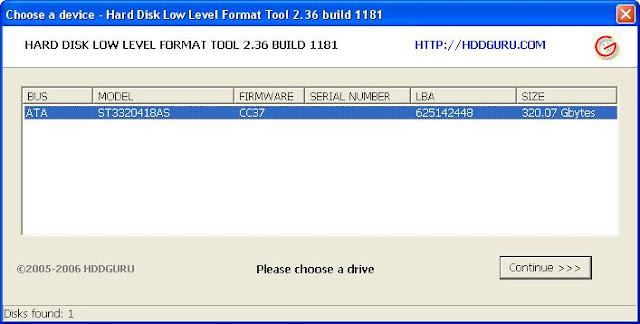 Pada gambar diatas, harddisk yang digunakan masih hanya satu, sehingga pilihan harddisk yang ditampilkan hanya satu. Jika harddisk yang bad sector sudah kita gandengkan, maka akan terdapat dua pilihan harddisk. Perhatikanlah jenis model hardisk yang terdapat pada HDD Low Level Format Tools tersebut dengan model yang tertulis pada harddisk yang terkena bad sector tersebut (jangan salah pilih, karena harddisk yang akan di format dengan low level akan mengakibatkan partisi dan data akan terhapus). Jika sudah memilih model harddisk yang terkena bad sector, clicklah tombol "Continue". Pada langkah berikutnya, pilihlah tab "Low-Level Format" dan click tombol "Format This Device"