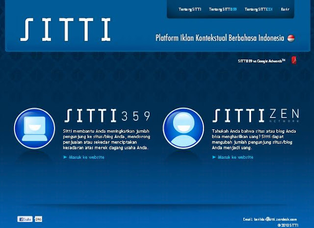 Saudara sebangsa dan setanah air... jika perjuangan anda dalam Google Adsense belum membuahkan hasil, janganlah patah semangat. Seperti kata para blogger yang telah gugur mendahului kita mengatakan "Masih Banyak Jalan ke Roma" maka demikian jugalah jalan untuk meningkatkan taraf hidup blogger melalui iklan di blog masing-masing. Salah satu alternatif pengganti Google Adsense yang patut dicoba adalah www.sitti.co.id yang merupakan salah satu platform iklan kontekstual berbahasa Indonesia. bagi anda yang ingin menjadi publisher SITTI, mendaftarlah dibagian SITTIZEN dengan mengisi data-data yang lengkap. Setelah mendaftar, tunggulah beberapa hari e-mail konfirmasi yang menyatakan bahwa situs/blog anda telah disetujui menjadi publisher. Sebagai warga negara Indonesia, marilah kita cintai produk dalam negri. Berikut adalah screenshoot situs SITTI yang telah lulus sensor: