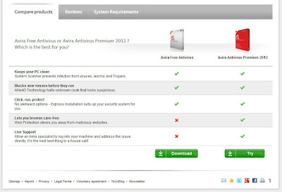 Antivirus dengan simbol payung merah ini mempunyai versi gratis dan premium. Versi premium tentu mempunyai nilai lebih dibandingkan dengan versi gratis, namun demikian versi gratis sudah cukup mumpuni untuk memberi perlindungan dasar (basic) bagi komputer anda. Untuk mengetahui kelebihan AVIRA Antivirus Premium 2012 dengan AVIRA Free Antivirus dapat anda lihat pada gambar dibawah ini (Jika anda tertarik menggunakan Avira Premium 2012, silahkan beli licensy key)