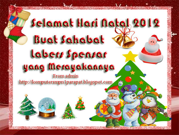 Hari ini 25 Desember 2012, seluruh umat beragama Kristen merayakan Natal diseluruh dunia. Pada kesempatan kali ini, admin blog ini menyempatkan diri untuk menyampaikan ucapan selamat Natal bagi seluruh pembaca blog ini yang merayakannya. Semoga kasih dan damai Natal memberi kedamaian bagi seluruh manusia di bumi ini.